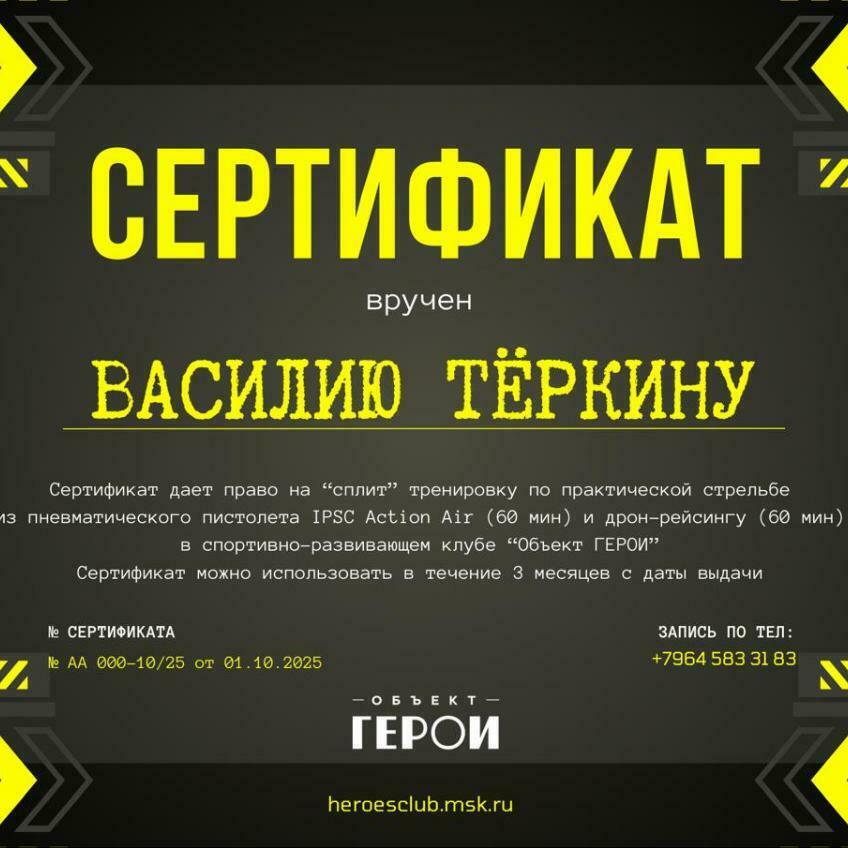 Подарочный сертификат клуба "Объект ГЕРОИ" отличный способ подарить новый опыт и возможность развиваться в интересной области.